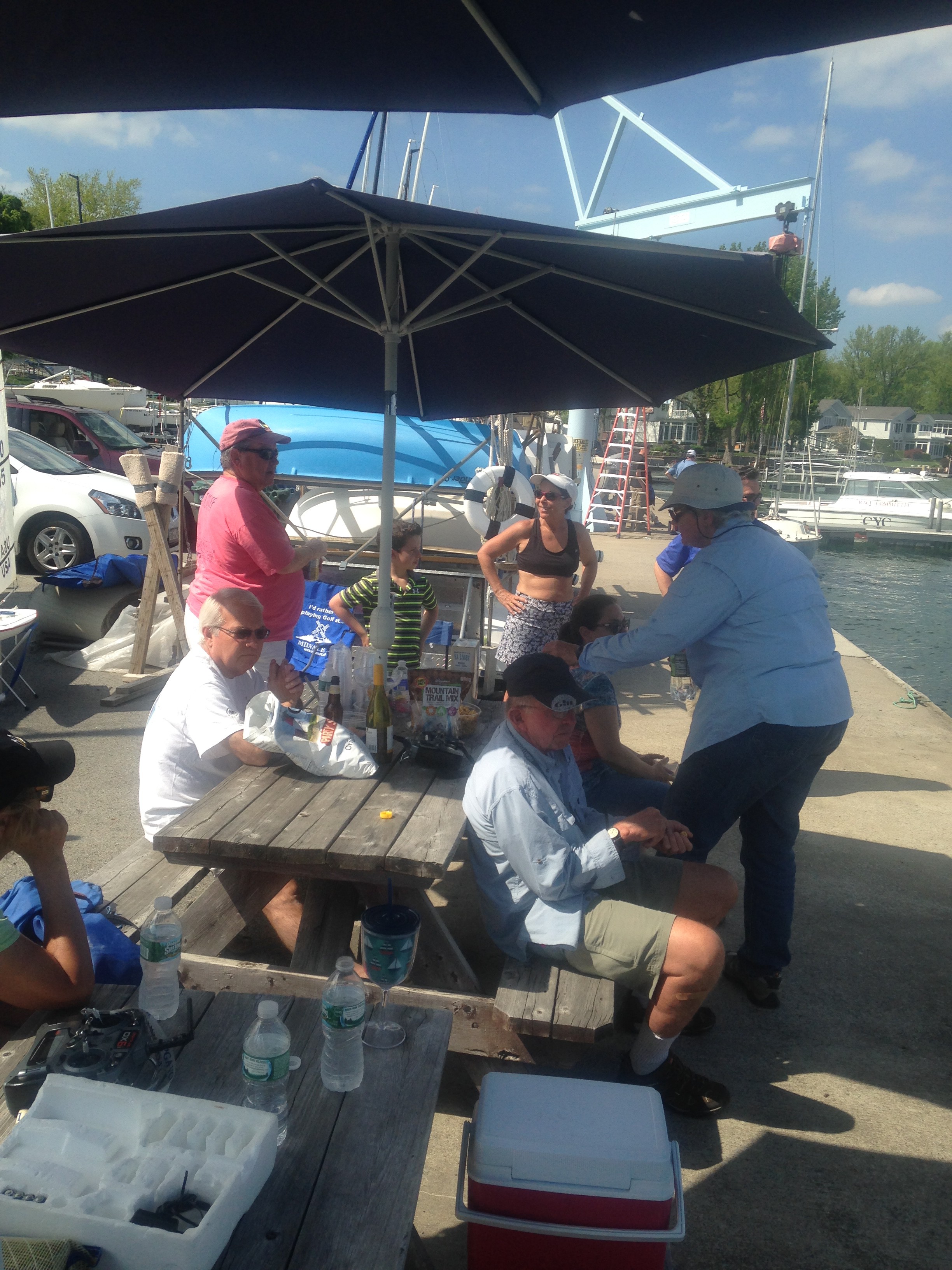It seems not so long ago there was a cover of white over the lake. Now we put up the umbrellas on the south dock and wait for the wind to fill in for RC racing. Here it is Sunday afternoon at 4pm and barely enough wind to get off one race for the eleven boats competing.